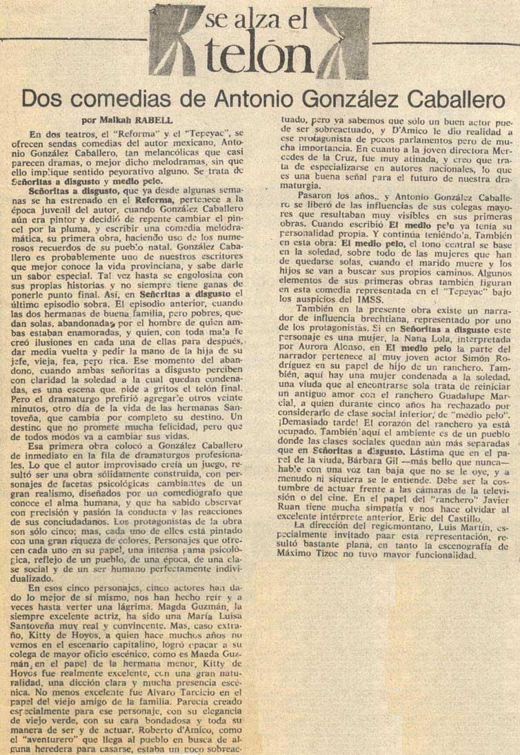 En dos teatros, el Reforma y el Tepeyac, se ofrecen sendas comedias del autor mexicano, Antonio González Caballero, tan melancólicas que casi parecen dramas, o mejor dicho melodramas, sin que ello implique sentido peyorativo alguno. Se trata de Señoritas a disgusto y Medio pelo.