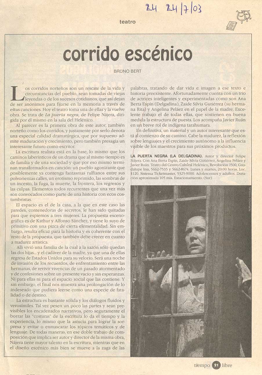 Los corridos norteños son un rescate de la vida y circunstancias del pueblo, sean tomadas de viejas leyendas o de los sucesos cotidianos, que así dejan de ser anónimos para fijarse en la memoria a través de estas canciones. Hoy el teatro toma una de ellas y la vuelve obra. Se trata de La puerta negra, de Felipe Nájera, dirigida por él mismo en la sala del Helénico.