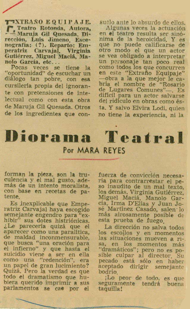 Extraño equipaje. Teatro Rotonda. Autora, Maruja Gil Quezada. Dirección, Luis Jimeno. Escenografía, (?). Reparto: Emperatriz Carvajal, Virginia Gutiérrez, Miguel Maciá, Manolo García, etc.