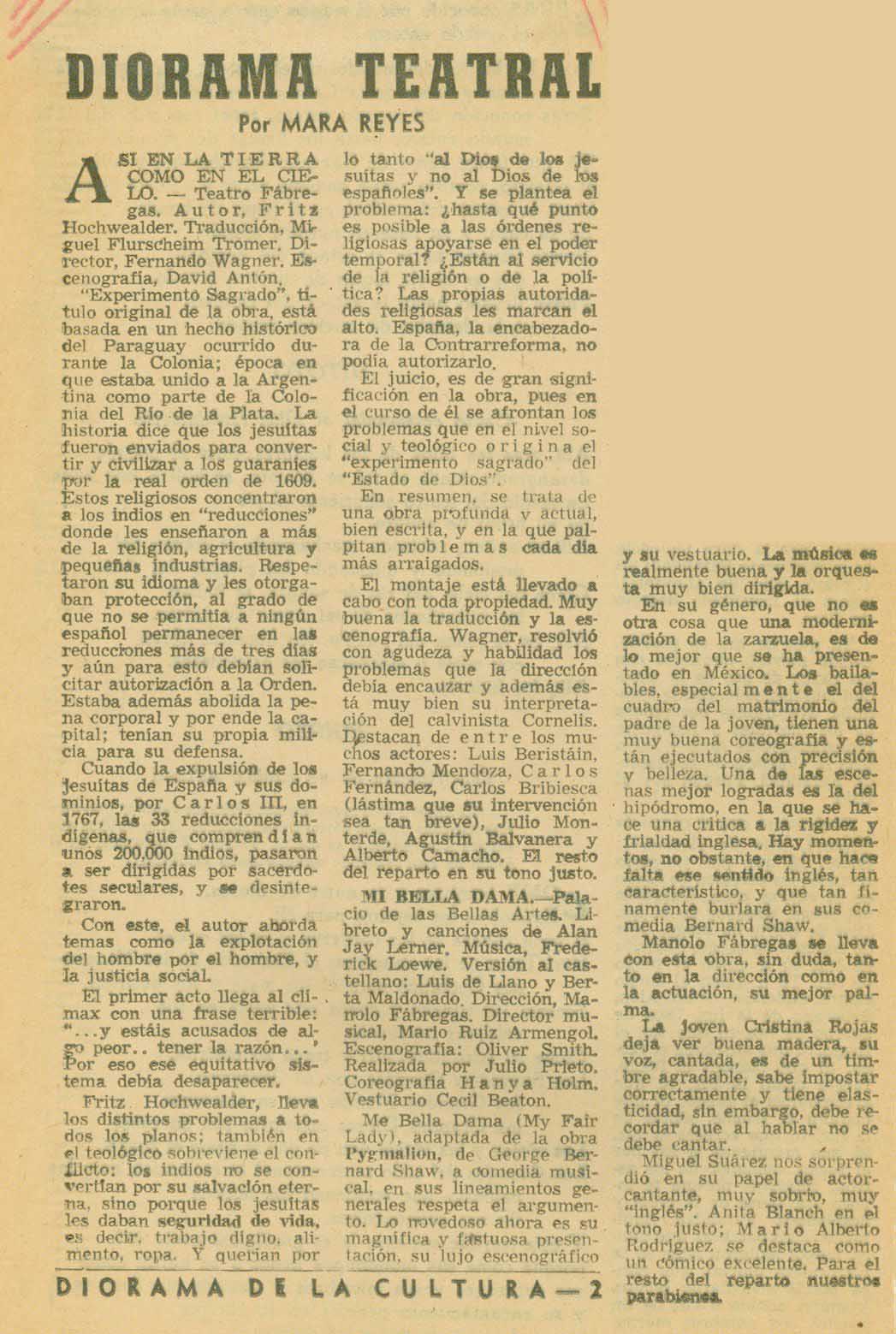 Cómo citar Reyes, Mara (seudónimo de Marcela del Río). "[Así en la tierra como en el cielo, Mi bella dama]". Diorama de la Cultura, 1959. Reseña Histórica del Teatro en México 2.0-2.1. Sistema de información de la crítica teatral, <criticateatral2021.org>
