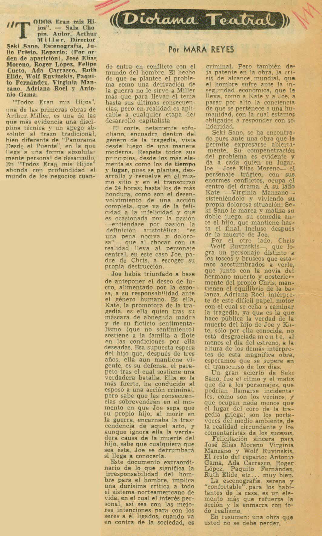 Todos eran mis hijos. Sala Chopin. Autor, Arthur Miller. Director Seki Sano. Escenografía, Julio Prieto, Reparto: (Por orden de aparición) José Elías Moreno, Roger López, Felipe Cueto, Ada Carrasco, Ruth Elide, Wolf Ruvinskis, Paquito Fernández, Virginia Manzano, Adriana Roel y Antonio Gama.