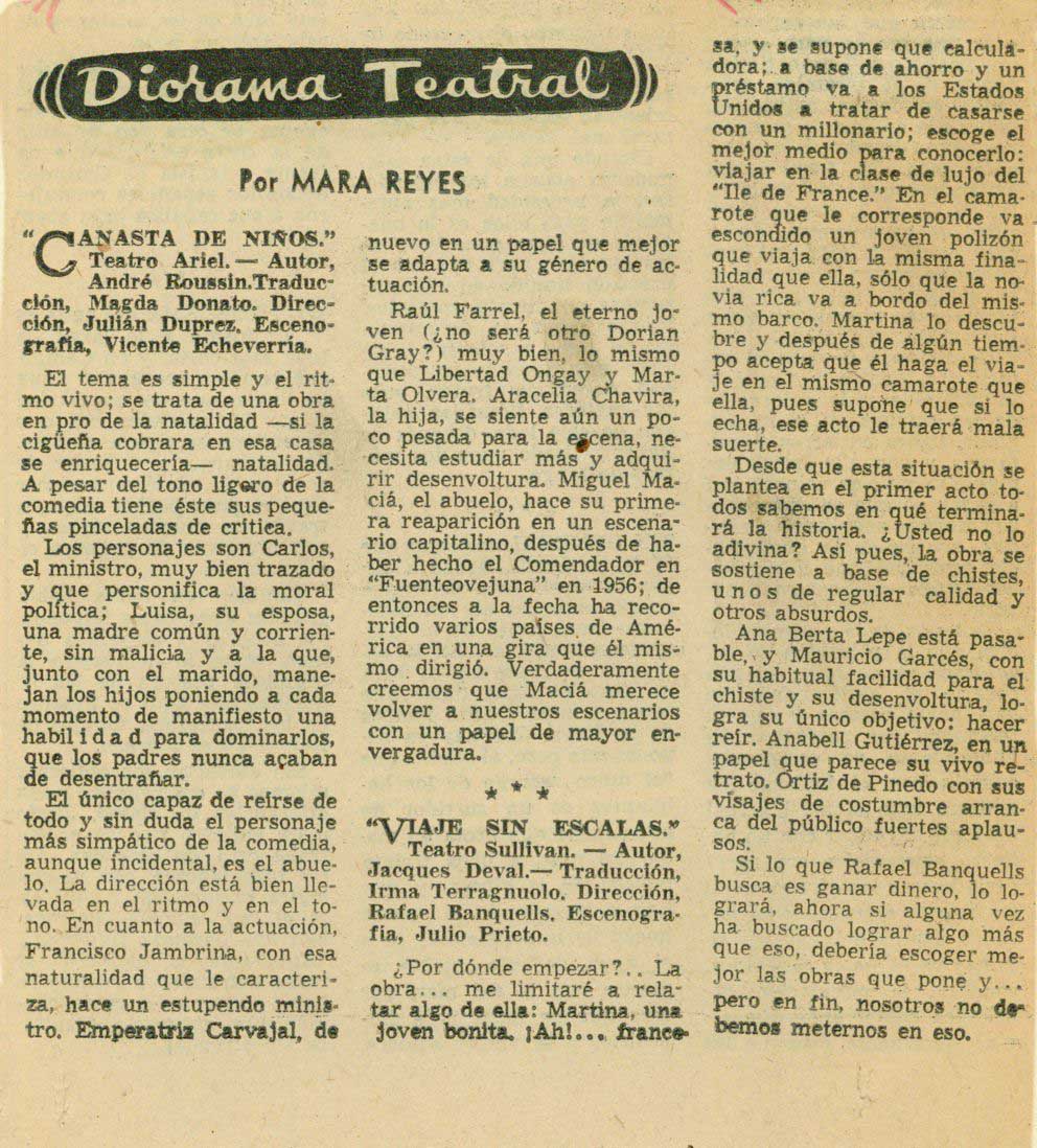 Cómo citar Reyes, Mara (seudónimo de Marcela del Río). "[Canasta de niños, Viaje sin escalas]". Diorama de la Cultura, 1959. Reseña Histórica del Teatro en México 2.0-2.1. Sistema de información de la crítica teatral, <criticateatral2021.org>
