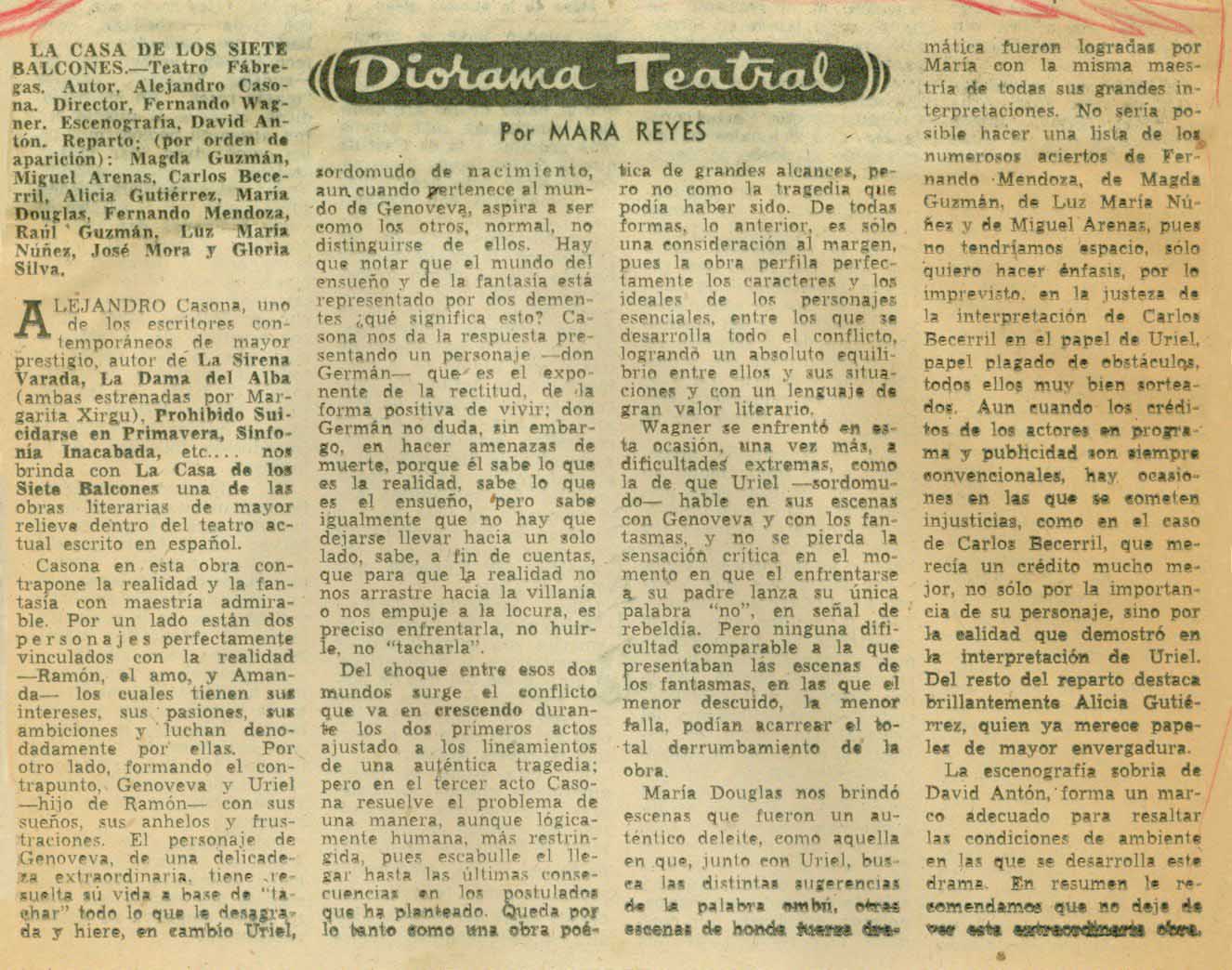 La casa de los siete balcones. Teatro Fábregas. Autor, Alejandro Casona. Director, Fernando Wagner. Escenografía, David Antón. Reparto: (por orden de aparición): Magda Guzmán, Miguel Arenas, Carlos Becerril, Alicia Gutiérrez, María Douglas, Fernando Mendoza, Raúl Guzmán, Luz María Núñez, José Mora y Gloria Silva.
