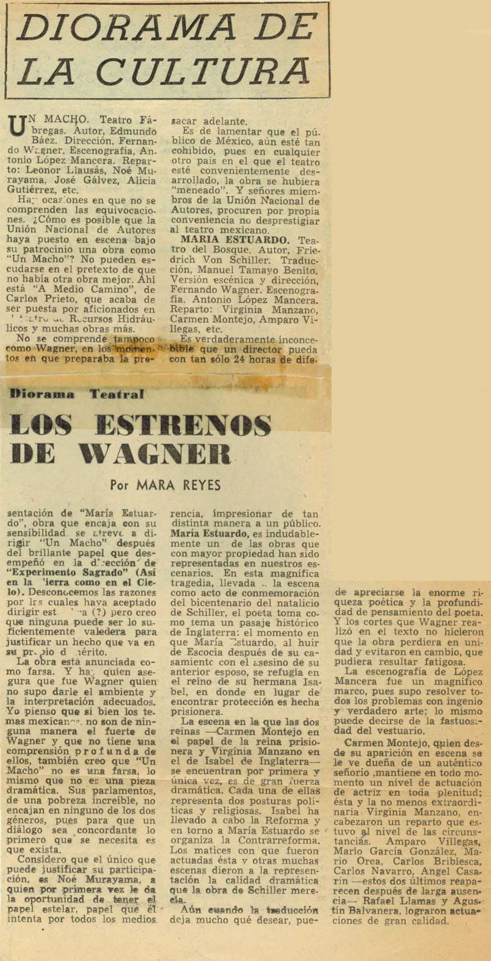 María Estuardo. Teatro del Bosque. Autor, Friedrich Schiller. Traducción, Manuel Tamayo Benito. Versión escénica y dirección, Fernando Wagner. Escenografía, Antonio López Mancera. Reparto: Virginia Manzano, Carmen Montejo, Amparo Villegas, etc.