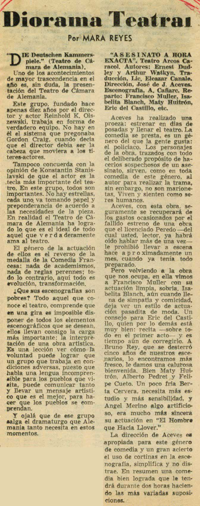 Asesinato a la hora exacta. Teatro Arcos Caracol. Autores, Ernest Dudley y Arthur Watkyn. Traducción, Lic. Eleazar Canale. Dirección, José de J. Aceves. Escenografía, A. Cañarc. Reparto: Francisco Muller, Isabel Blanch, Maty Huitrón, Eric del Castillo, etc.
