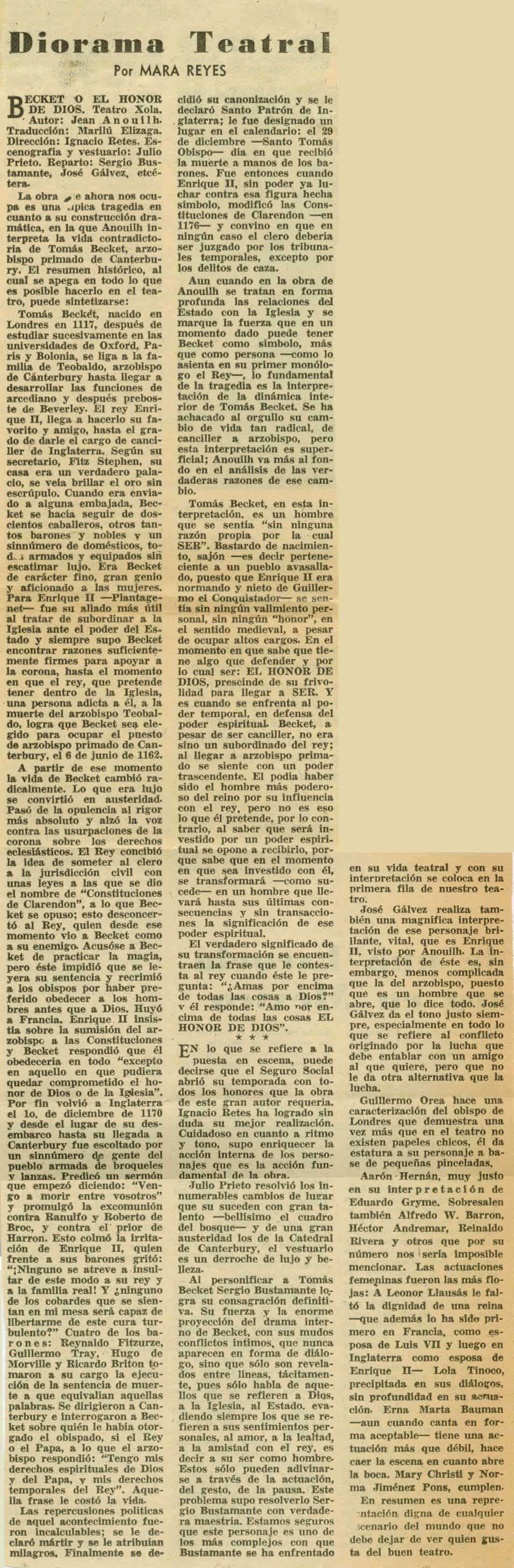 Becket o el honor de Dios. Teatro Xola. Autor, Jean Anouilh. Traducción, Marilú Elízaga. Dirección, Ignacio Retes. Escenografía y vestuario, Julio Prieto. Reparto: Sergio Bustamante, José Gálvez, etcétera.