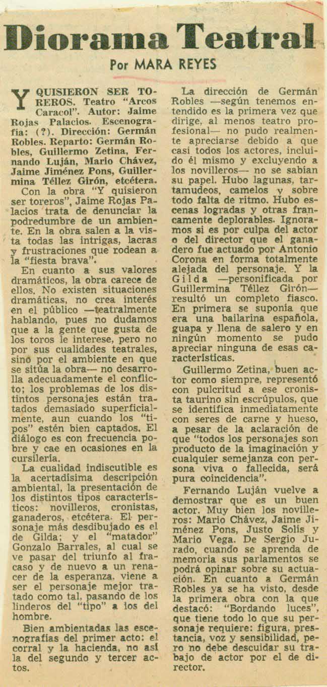Y quisieron ser toreros. Teatro Arcos Caracol. Autor, Jaime Rojas Palacios. Escenografía, (?). Dirección, Germán Robles. Reparto: Germán Robles, Guillermo Zetina, Fernando Luján, Mario Chávez, Jaime Jiménez Pons, Guillermina Téllez Girón, etcétera.