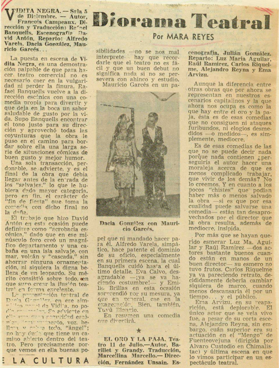 Cómo citar Reyes, Mara (seudónimo de Marcela del Río). "[Vidita negra, El oro y la paja]". Diorama de la Cultura, 1961. Reseña Histórica del Teatro en México 2.0-2.1. Sistema de información de la crítica teatral, <criticateatral2021.org>