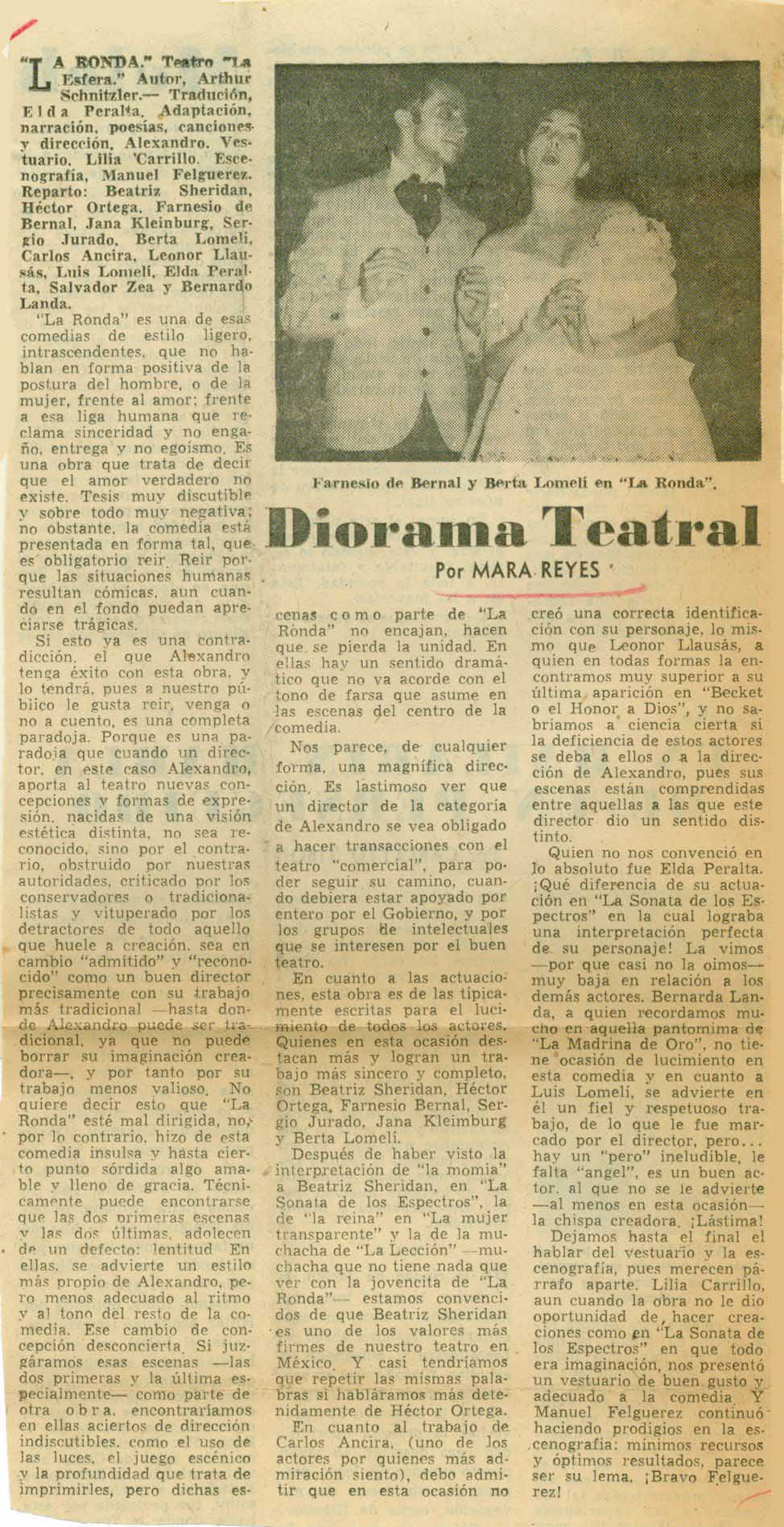 La ronda. Teatro La Esfera. Autor, Arthur Schnitzler. Traducción, Elda Peralta. Adaptación, narración, poesías, canciones y dirección, Alexandro. Vestuario, Lilia Carrillo. Escenografía, Manuel Felguérez. Reparto: Beatriz Sheridan, Héctor Ortega, Farnesio de Bernal, Jana Kleinburg, Sergio Jurado, Berta Lomelí, Carlos Ancira, Leonor Llausás, Luis Lomelí, Elda Peralta, Salvador Zea, Bernarda Landa.
