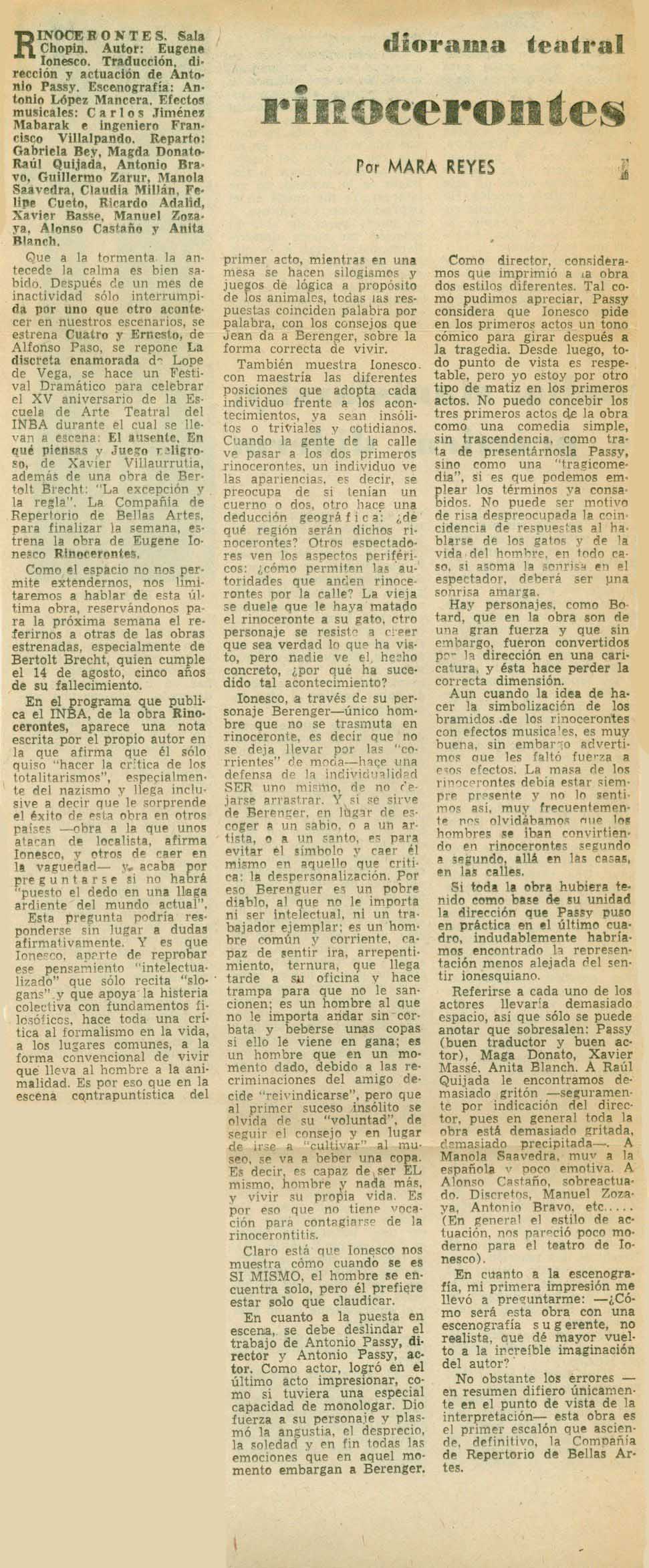Rinocerontes. Sala Chopin. Autor, Eugène Ionesco. Traducción, dirección y actuación de Antonio Passy. Escenografía, Antonio López Mancera. Efectos musicales, Carlos Jiménez Mabarak e ingeniero Francisco Villalpando. Reparto: Gabriela Bey, Magda Donato, Raúl Quijada, Antonio Bravo, Guillermo Zarur, Manola Saavedra, Claudia Millán, Felipe Cueto, Ricardo Adalid, Xavier Massé, Manuel Zozaya, Alonso Castaño y Anita Blanch.