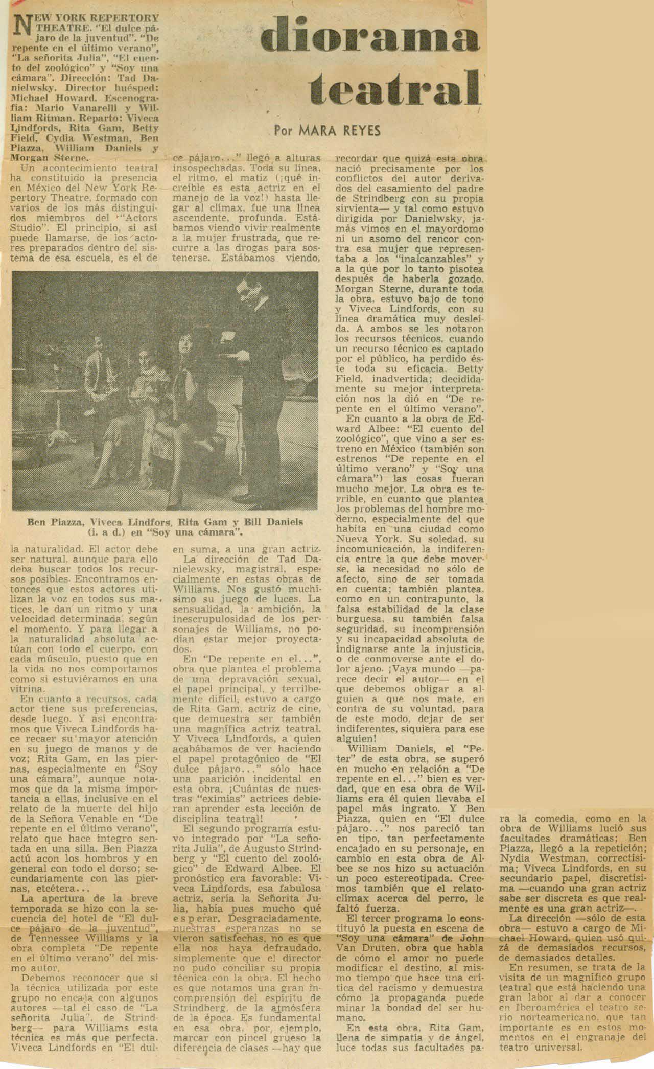 En De repente en el..., obra que plantea el problema de una depravación sexual, el papel principal, y terriblemente difícil, estuvo a cargo de Rita Gam, actriz de cine, que demuestra ser también una magnífica actriz teatral. Y Viveca Lindfords, a quien acabábamos de ver haciendo el papel protagónico de El dulce pájaro... sólo hace una aparición incidental en esta obra. ¡Cuántas de nuestras “eximias” actrices debieran aprender esta lección de disciplina teatral!
