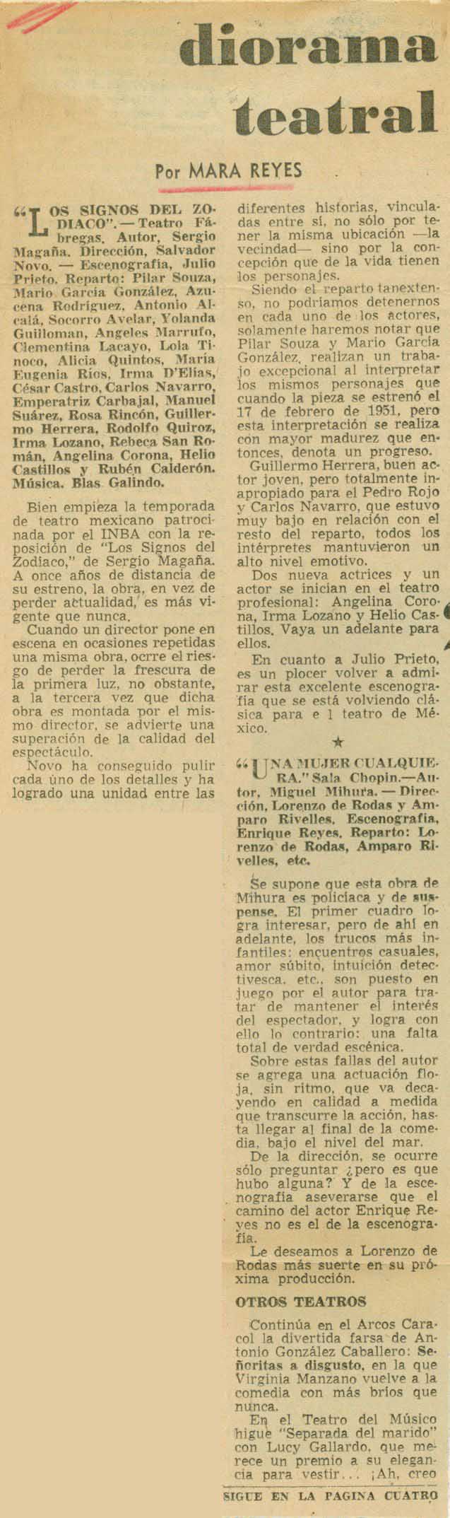 Los signos del zodiaco. Teatro Fábregas. Autor, Sergio Magaña. Dirección, Salvador Novo. Escenografía, Julio Prieto. Reparto: Pilar Souza, Mario García González, Azucena Rodríguez, Antonio Alcalá, Socorro Avelar, Yolanda Guillaumín, Ángeles Marrufo, Clementina Lacayo, Lola Tinoco, Alicia Quintos, María Eugenia Ríos, Irma D'Elías, César Castro, Carlos Navarro, Emperatriz Carvajal, Manuel Suárez, Rosa Rincón, Guillermo Herrera, Rodolfo Quiroz, Irma Lozano, Rebeca Sanromán, Angelina Corona, Helio Castillos y Rubén Calderón. Música, Blas Galindo.
