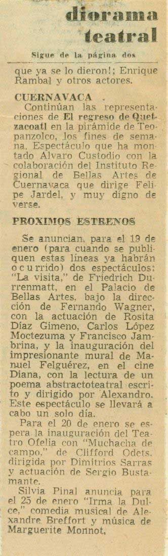 Se anuncian, para el 19 de enero (para cuando se publiquen estas líneas ya habrán ocurrido) dos espectáculos; La visita, de Friedrich Dürrenmatt, en el Palacio de Bellas Artes, bajo la dirección de Fernando Wagner, con la actuación de Rosita Díaz Gimeno, Carlos López Moctezuma y Francisco Jambrina, y la inauguración del impresionante mural de Manuel Felguérez, en el cine Diana, con la lectura de un poema abstracto teatral escrito y dirigido por Alexandro. Este espectáculo se llevará a cabo un solo día.