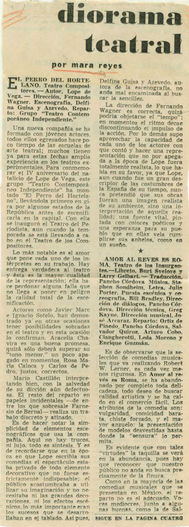 Cómo citar Reyes, Mara (seudónimo de Marcela del Río). "[El perro del hortelano, Amor al revés es Roma]". Diorama de la Cultura, 1962. Reseña Histórica del Teatro en México 2.0-2.1. Sistema de información de la crítica teatral, <criticateatral2021.org>