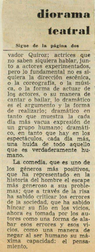 Como en la mayoría de las comedias musicales que se presentan en México, el reparto no es el adecuado. Voces mediocres, junto a algunas buenas, como la de Salvador [p. 4] Quiroz; actrices que no saben siquiera hablar, junto a actores experimentados, pero lo fundamental no es siquiera la dirección escénica, o la coreografía, o la música, o la forma de actuar de los actores, o su manera de cantar o bailar, lo dramático es el argumento y la forma de realizarlo; dramático en tanto que muestra la cada día más vacua expresión de un grupo humano; dramático, en tanto que hay en los espectáculos, cada día más, una huida de todo aquello que es verdaderamente humano.