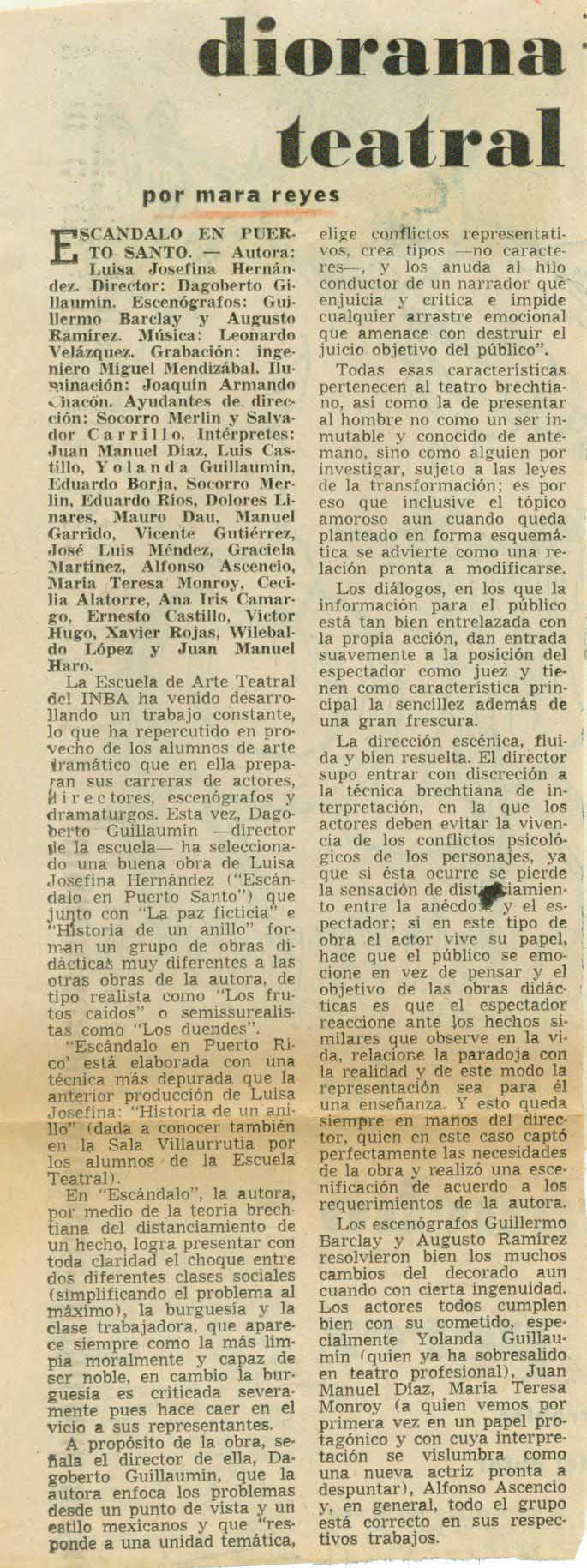 Escándalo en Puerto Santo. Autora, Luisa Josefina Hernández. Director, Dagoberto Gillaumín. Escenógrafos, Guillermo Barclay y Augusto Ramírez. Música, Leonardo Velázquez. Grabación, ingeniero Miguel Mendizábal. Iluminación, Joaquín Armando Chacón. Ayudantes de dirección, Socorro Merlín y Salvador Carrillo. Intérpretes: Juan Manuel Díaz, Luis Castillo, Yolanda Guillaumín, Eduardo Borja, Socorro Merlín, Eduardo Ríos, Dolores Linares, Mauro Dau, Manuel Garrido, Vicente Gutiérrez, José Luis Méndez, Graciela Martínez, Alfonso Ascencio, María Teresa Monroy, Cecilia Alatorre, Ana Iris Camargo, Ernesto Castillo, Víctor Hugo, Xavier Rojas, Wilebaldo López y Juan Manuel Haro.