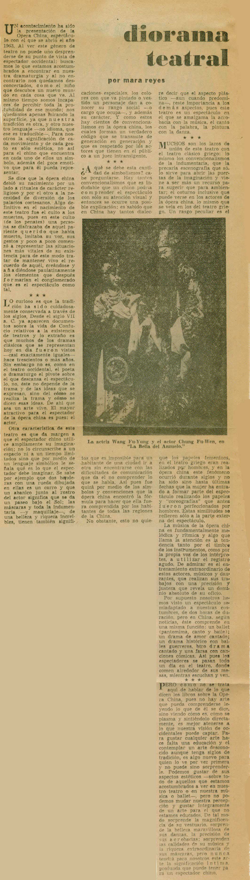 Cómo citar Reyes, Mara (seudónimo de Marcela del Río). "[Ópera china]". Diorama de la Cultura, 1963. Reseña Histórica del Teatro en México 2.0-2.1. Sistema de información de la crítica teatral, <criticateatral2021.org>