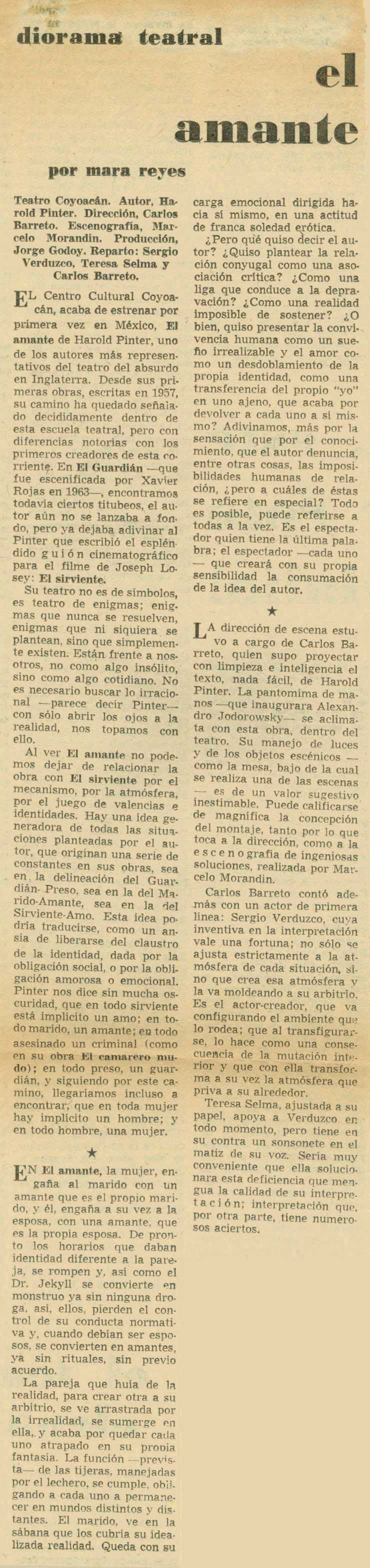 El Centro Cultural Coyoacán, acaba de estrenar por primera vez en México, El amante de Harold Pinter, uno de los autores más representativos del teatro del absurdo en Inglaterra. Desde sus primeras obras, escritas en 1957, su camino ha quedado señalado decididamente dentro de esta escuela teatral, pero con diferencias notorias con los primeros creadores de esta corriente. En El guardián –que fue escenificada por Xavier Rojas en 1963–, encontramos todavía ciertos titubeos, el autor aún no se lanzaba a fondo, pero ya dejaba adivinar al Pinter que escribió el espléndido guión cinematográfico para el filme de Joseph Losey : El sirviente.