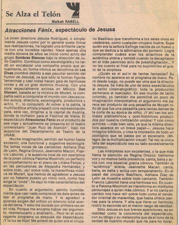 La joven directora Jesusa Rodríguez, o simplemente Jesusa como por lo general suele firmar sus realizaciones, ha logrado una brillante carrera con una increíble rapidez. Hace apenas una media docena de años se inició como actriz del grupo Sombras Blancas bajo la dirección de Julio Castillo. Continuó como escenógrafa y no tardó en encabezar una compañía propia que actualmente, en forma irónica se denomina de Las Divas (nombre debido a ese peculiar sentido del humor de Jesusa), ya que sólo la forman figuras femeninas y casi todas hacen gala de hermosas voces y de un gran dominio musical. Con una obra especialmente exitosa en México, Don Giovani, basada en la música de Mozart, la compañía salió a conquistar el mundo con Jesusa como autora, directora, escenógrafa, productora y actriz. Y... lo conquistó. Al volver a la patria, la multifacética artista preparó otra representación para, esta vez, dirigirse a la capital de Austria, donde la invitaron para el Festival de Viena. El espectáculo Atracciones Fénix es el producto de ese viaje y actualmente se presenta en el teatro universitario "Juan Ruiz de Alarcón", bajo los auspicios del Departamento de Teatro de la UNAM.