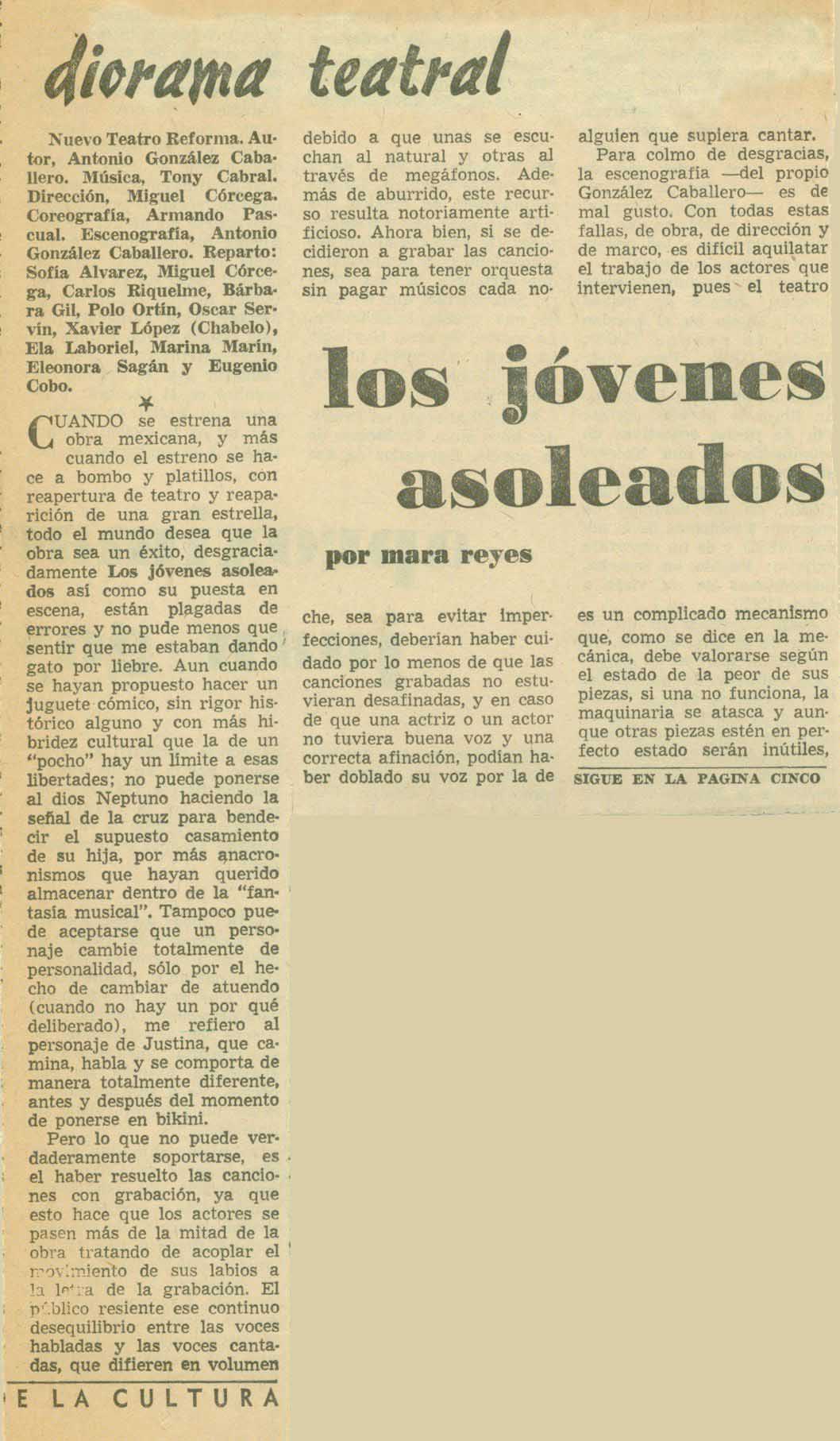 Cómo citar Reyes, Mara (seudónimo de Marcela del Río). "Los jóvenes asoleados". Diorama de la Cultura, 1967. Reseña Histórica del Teatro en México 2.0-2.1. Sistema de información de la crítica teatral, <criticateatral2021.org>