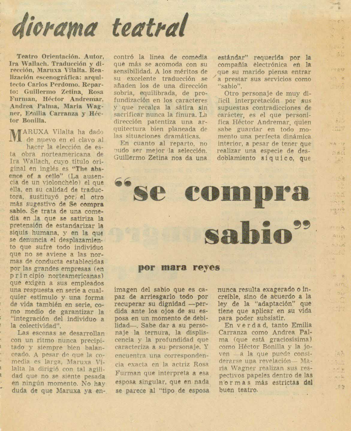 Maruxa Vilalta ha dado de nuevo en el clavo al hacer la elección de esta obra norteamericana de Ira Wallach, cuyo título original en inglés es The absence of a cello (La ausencia de un violonchelo) el que ella, en su calidad de traductora, sustituyó por el otro más sugestivo de Se compra sabio. Se trata de una comedia en la que se satiriza la pretensión de estandarizar la psiquis humana, y en la que se denuncia el desplazamiento que sufre todo individuo que no se aviene a las normas de conducta establecidas por las grandes empresas (en principio norteamericanas) que exigen a sus empleados una respuesta en serie a cualquier estímulo y una forma de vida también en serie, como medio de garantizar la “integración del individuo a la colectividad”.