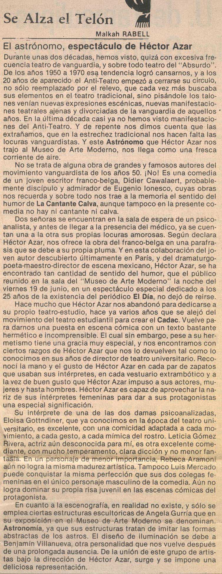 Durante unas dos décadas, hemos visto, quizá con excesiva frecuencia teatro de vanguardia, y sobre todo teatro del "Absurdo". De los años 1950 a 1970 esa tendencia logró cansarnos, y a los 20 años de aparecido el Anti-Teatro empezó a cerrarse su círculo, no sólo reemplazado por el relevo, que cada vez más buscaba sus elementos en el teatro tradicional, sino pisándole los talones venían nuevas expresiones escénicas, nuevas manifestaciones teatrales ajenas y divorciadas de la vanguardia de aquellos años. En la última década casi ya no hemos visto manifestaciones del Anti-Teatro. Y de repente nos dimos cuenta que las extrañarnos, que en la estrechez tradicional nos hacen falta las locuras vanguardistas. Y este Astrónomo que Héctor Azar nos trajo al Museo de Arte Moderno, nos llega como una fresca corriente de aire.