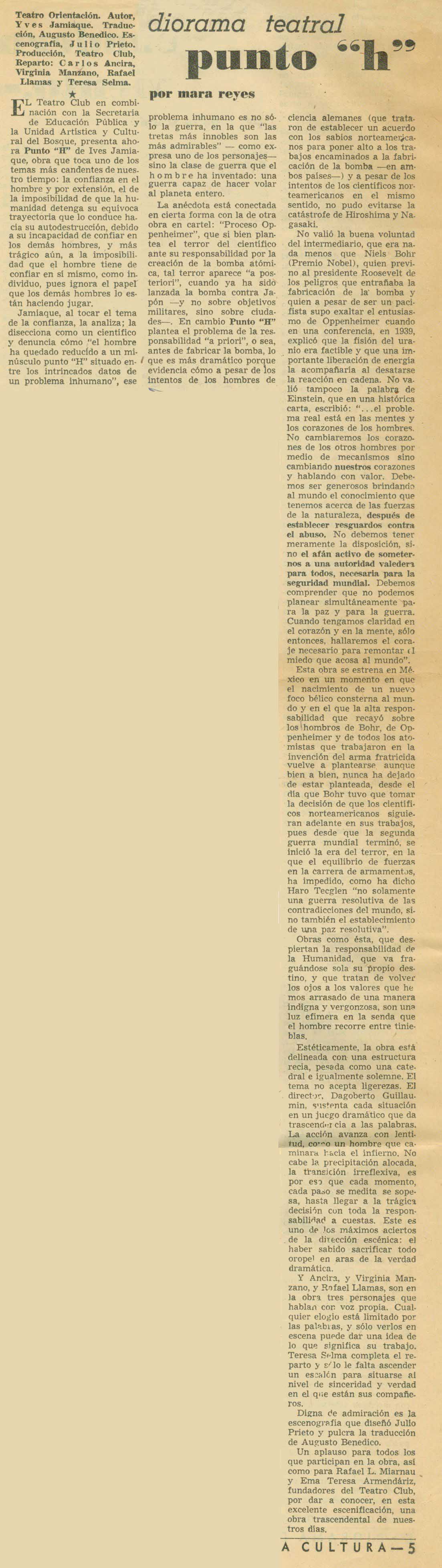 Cómo citar Reyes, Mara (seudónimo de Marcela del Río). "Punto H". Diorama de la Cultura, 1967. Reseña Histórica del Teatro en México 2.0-2.1. Sistema de información de la crítica teatral, <criticateatral2021.org>