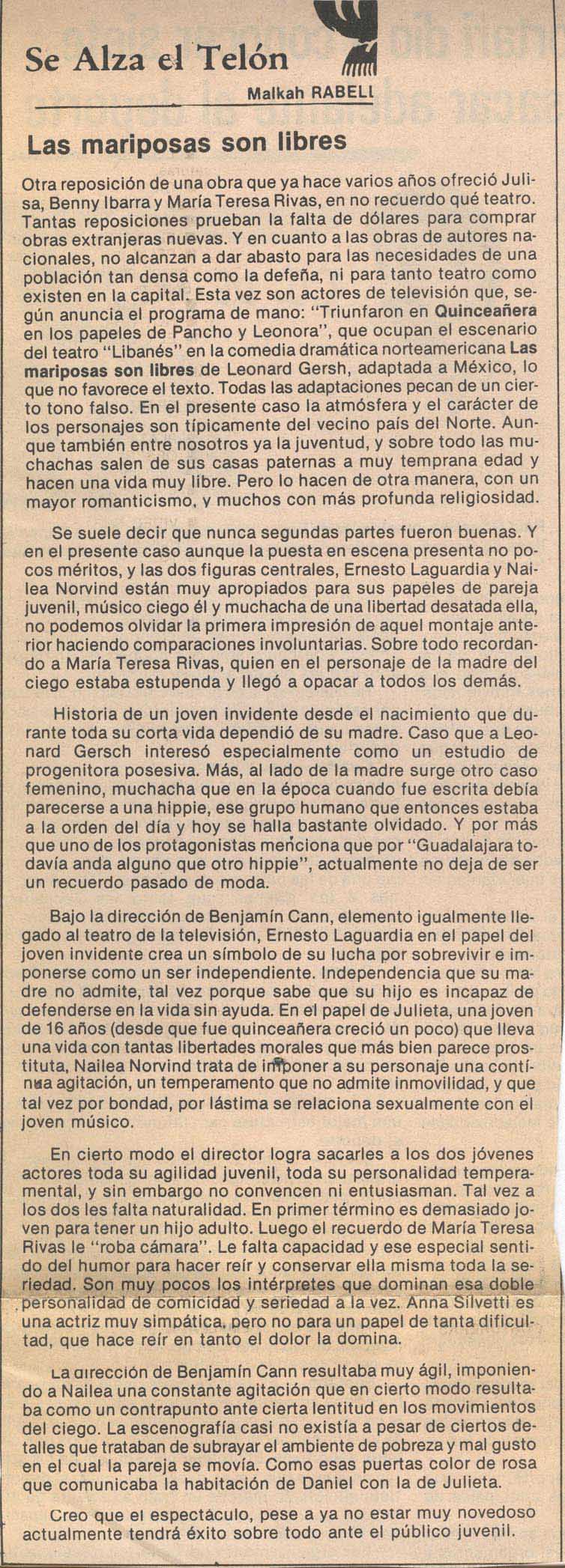 Cómo citar Rabell, Malkah. "Las mariposas son libres". El Día, 1988. Reseña Histórica del Teatro en México 2.0-2.1. Sistema de información de la crítica teatral, <criticateatral2021.org>