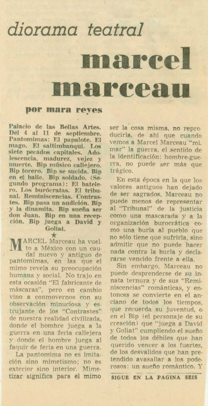 Marcel Marceau ha vuelto a México con un caudal nuevo y antiguo de pantomimas, en las que el mimo revela su preocupación humana y social. No trajo en esta ocasión El fabricante de máscaras, pero en cambio vino a conmovernos con su observación minuciosa y estrujante de los Contrastes de nuestra realidad civilizada, donde el hombre juega a la guerra en una feria callejera y donde el hombre juega al faquir de feria en una guerra.
