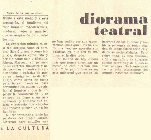 La expresión mímica es casi tan antigua como el hombre. Sirvió primero como lenguaje, después como arte y filosofía. Ahora, Marceau, sin privarlo de su carácter filosófico y artístico –por lo contrario agudizándolos– enfatiza de nuevo su primigenio uso del lenguaje, como arma de lucha para borrar fronteras, para derrumbar los muros que aíslan al hombre y que le impiden la comunicación; y se entrega de lleno a un arte universal y humano que enlaza y estrecha los vínculos que todavía pueden unir a los hombres.