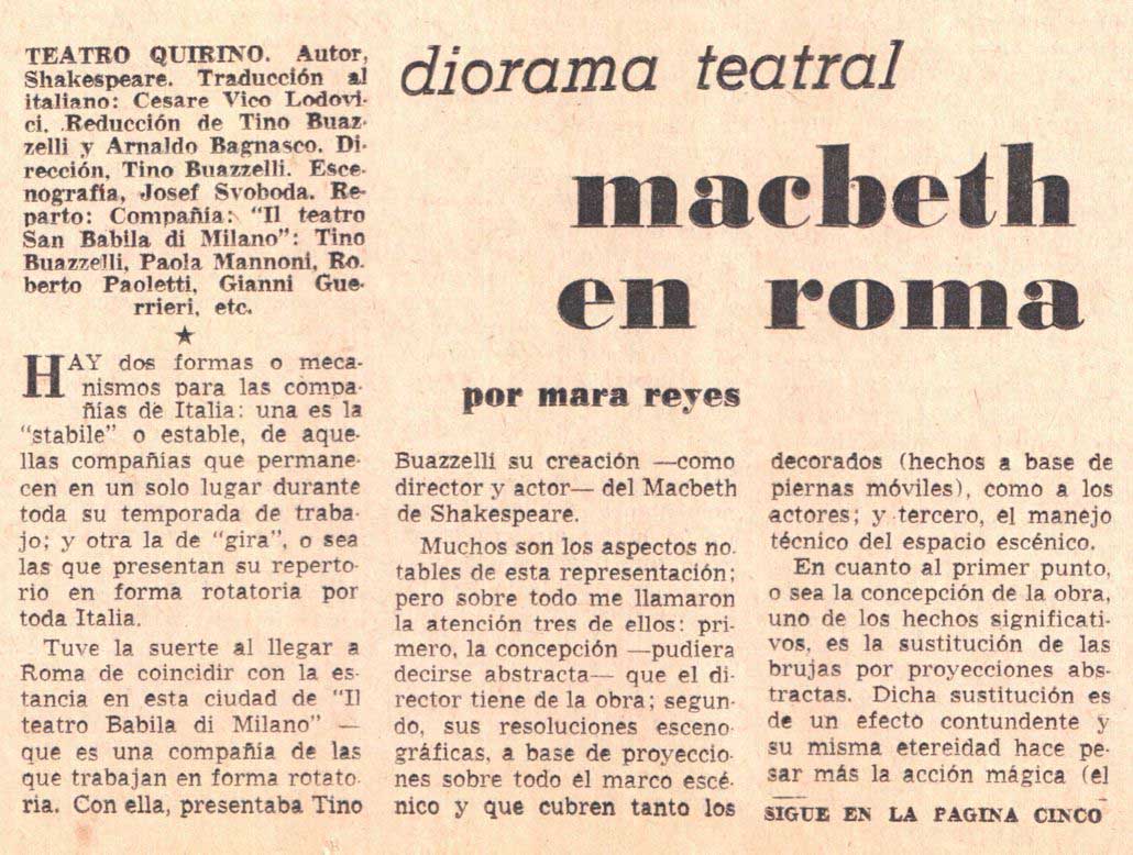 Tuve la suerte de coincidir con la estancia en esta ciudad de Il teatro Babila di Milano –que es una compañía de las que trabajan en forma rotatoria. Con ella, presentaba Tino Buazelli su creación –como director y actor– del Macbeth de Shakespeare.