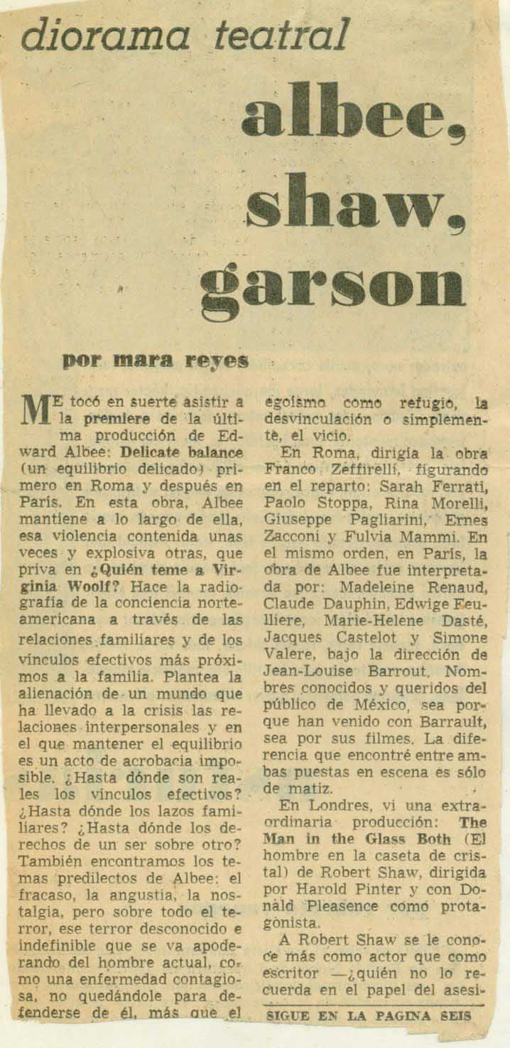 Cómo citar Reyes, Mara (seudónimo de Marcela del Río). "Albee, Shaw, Garson". Diorama de la Cultura, 1967. Reseña Histórica del Teatro en México 2.0-2.1. Sistema de información de la crítica teatral, <criticateatral2021.org>