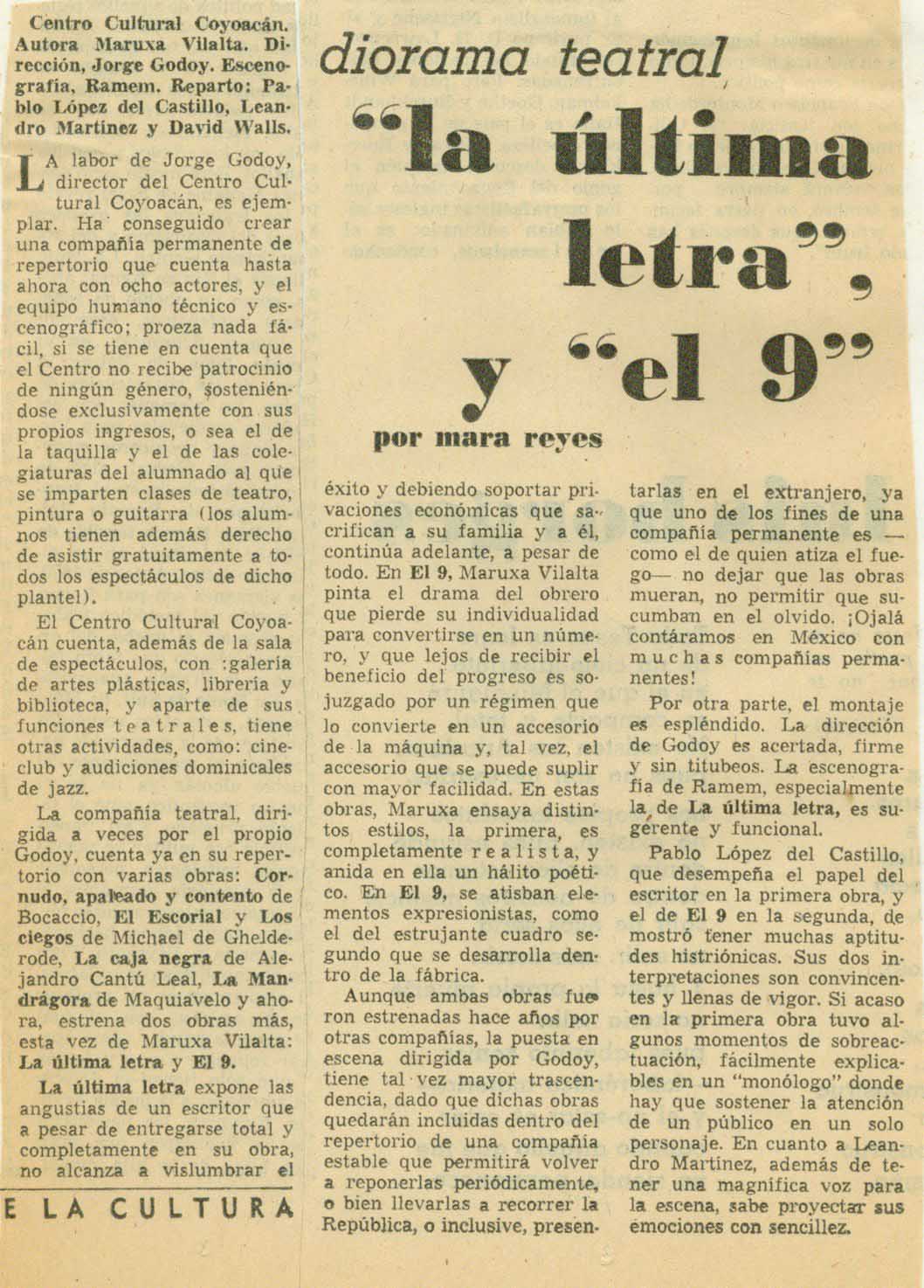 Cómo citar Reyes, Mara (seudónimo de Marcela del Río). "La última letra y El 9". Diorama de la Cultura, 1968. Reseña Histórica del Teatro en México 2.0-2.1. Sistema de información de la crítica teatral, <criticateatral2021.org>