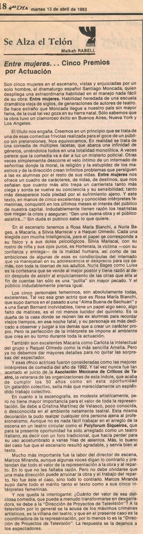 Son cinco mujeres en el escenario, vistas y enjuiciadas por un solo hombre, el dramaturgo español Santiago Moncada, quien despliega una extraordinaria habilidad en el manejo nada fácil de su obra: Entre mujeres. Habilidad heredada de una escuela dramática vieja de siglos, de generaciones de autores de teatro. Se hace extraño que Moncada llegue a nuestro país sin mayor fama, de la cual tal vez goza en su tierra natal. Sólo sabemos que la obra tuvo un clamoroso éxito en Buenos Aires, Nueva York y Los Ángeles.