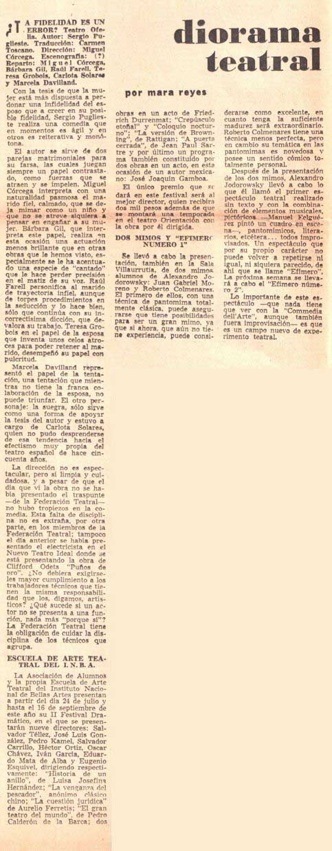 Cómo citar Reyes, Mara (seudónimo de Marcela del Río)Reyes, Mara (seudónimo de Marcela del Río). "[¿La fidelidad es un error?, Efímero número 1]". Diorama de la Cultura, 1962. Reseña Histórica del Teatro en México 2.0-2.1. Sistema de información de la crítica teatral, <criticateatral2021.org>