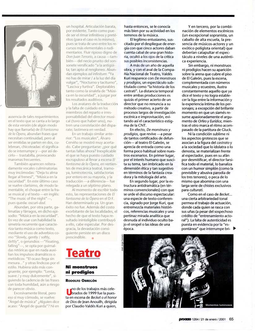 Uno de los trabajos más celebrados de 1999 fue la puesta en escena de Becket o el honor de Dios de Jean Anouilh, dirigida por Claudio Valdés Kuri a quien, hasta entonces, se le conocía más bien por su actividad en los terrenos de la música.