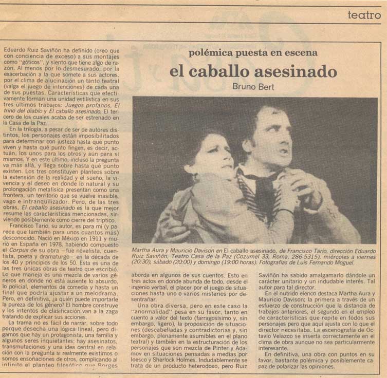 El caballo asesinado". Tiempo Libre, 1989. Reseña Histórica del Teatro en México 2.0-2.1. Sistema de información de la crítica teatral, <criticateatral2021.org>