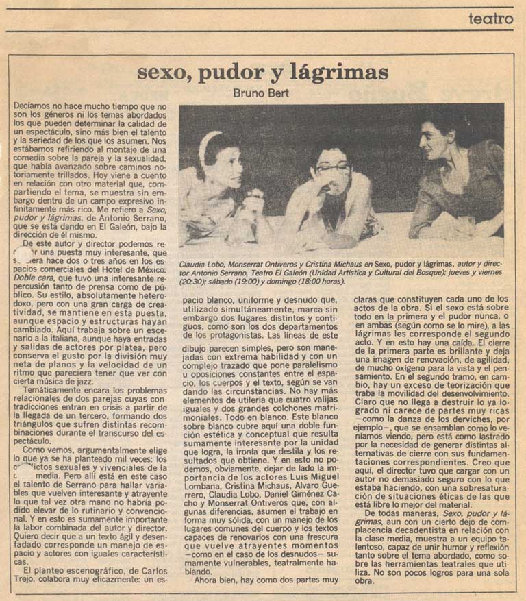 Cómo citar Bert, Bruno. "Sexo, pudor y lágrimas". Tiempo Libre, 1991. Reseña Histórica del Teatro en México 2.0-2.1. Sistema de información de la crítica teatral, <criticateatral2021.org>