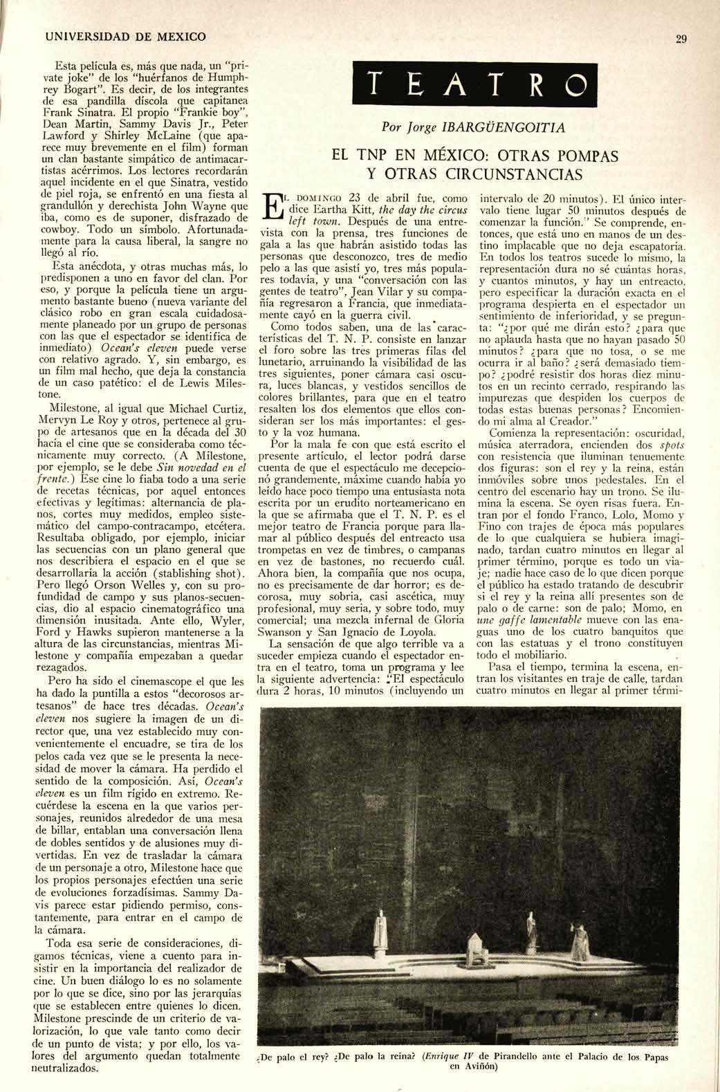 Por la mala fe con que está escrito el presente artículo, el lector podrá darse cuenta de que el espectáculo me decepcionó grandemente, máxime cuando había yo leído hace poco tiempo una entusiasta nota escrita por un erudito norteamericano en la que se afirmaba que el T. N. P. es el mejor teatro de Francia porque para llamar al público después del entreacto usa trompetas en vez de timbres, o campanas en vez de bastones, no recuerdo cuál. Ahora bien, la compañía que nos ocupa, no es precisamente de dar horror; es decorosa, muy sobria, casi ascética, muy profesional, muy seria, y sobre todo, muy comercial; una mezcla infernal de Gloria Swanson y San Ignacio de Loyola.