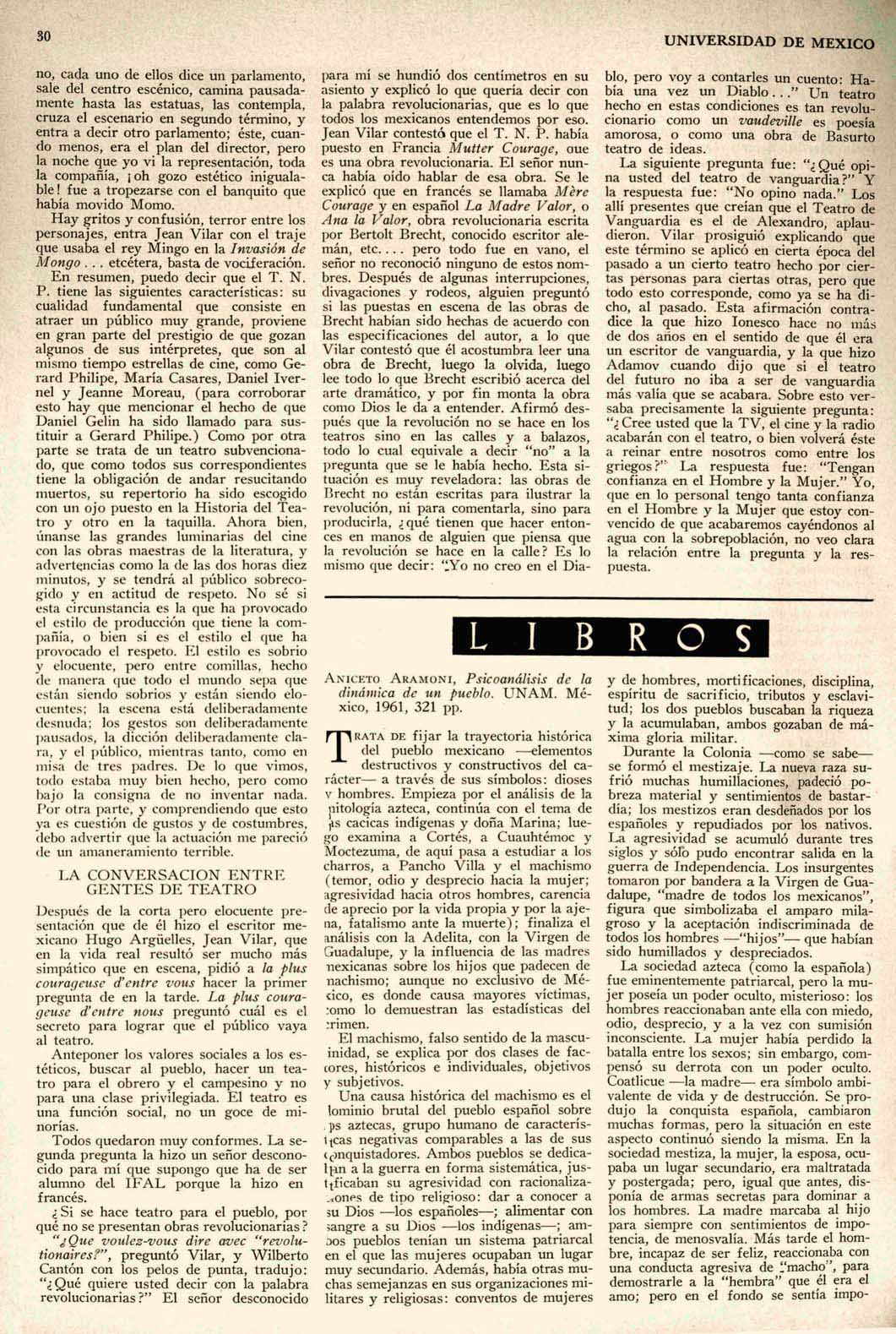 ¿Si se hace teatro para el pueblo, por qué no se presentan obras revolucionarias? “¿Que voulez-vous dire avec “revolutionaires?”, pregunto Vilar, y Wilberto Cantón con los pelos de punta, tradujo: “¿Qué quiere usted decir con la palabra revolucionarias?” El señor desconocido para mí se hundió dos centímetros en su asiento y explicó lo que quería decir con la palabra revolucionarias, que es lo que todos los mexicanos entendemos por eso. Jean Vilar contestó que el T. N. P. había puesto en Francia Mutter Courage, que es una obra revolucionaria. El señor nunca había oído hablar de esa obra. Se le explicó que en francés se llamaba Mere Courage y en español La Madre Valor o Ana la Valor, obra revolucionaria escrita por Bertolt Brecht, conocido escritor alemán, etc... pero todo fue en vano, el señor no reconoció ninguno de estos nombres. Después de algunas interrupciones, divagaciones y rodeos, alguien preguntó si las puestas en escena de las obras de Brecht habían sido hechas de acuerdo con las especificaciones del autor, a lo que Vilar contestó que él acostumbra leer una obra de Brecht, luego la olvida, luego lee todo lo que Brecht escribió acerca del arte dramático, y por fin monta la obra como Dios le da a entender. Afirmó después que la revolución no se hace en los teatros sino en las calles y a balazos, todo lo cual equivale a decir "no" a la pregunta que se le había hecho. Esta situación es muy reveladora: las obras de Brecht no están escritas para ilustrar la revolución, ni para comentarla, sino para producirla, ¿qué tienen que hacer entonces en manos de alguien que piensa que la revolución se hace en la calle? Es lo mismo que decir: “Yo no creo en el Diablo, pero voy a contarles un cuento: Había una vez un Diablo…” Un teatro hecho en estas condiciones es tan revolucionarios como un vaudeville es poesía amorosa, o como una obra de Basurto teatro de ideas.