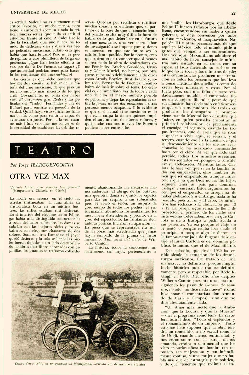 Este episodio, que desde 1930 ha venido siendo la tentación de los dramaturgos mexicanos, fue tratado de una manera... no definitiva, porque ningún hecho histórico puede tratarse definitivamente, pero sí respetable, por Rodolfo Usigli en 1943. Dieciocho años después Wilberto Cantón presenta una obra que, siguiendo los pasos de Corona de sombra, no sólo "no dice nada nuevo" (como hizo notar el comentarista don Armando de Maria y Campos), sino que no dice absolutamente nada.