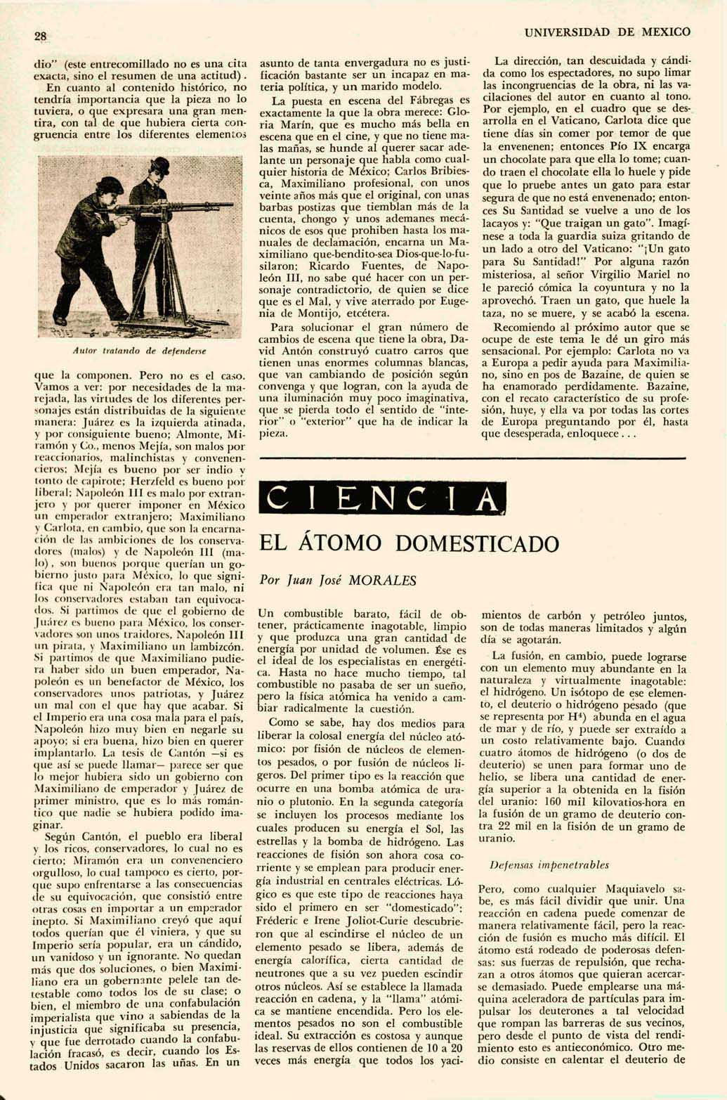 En cuanto al contenido histórico, no tendría importancia que la pieza no lo tuviera, o que expresara una gran mentira, con tal de que hubiera cierta congruencia entre los diferentes elementos que la componen. Pero no es el caso. Vamos a ver: por necesidades de la marejada, las virtudes de los diferentes personajes están distribuidas de la siguiente manera: Juárez es la izquierda atinada, y por consiguiente bueno; Almonte, Miramón y Co., menos Mejía, son malos por reaccionarios, malinchistas y convenencieros; Mejía es bueno por ser indio y tonto de capirote; Herzfeld es bueno por liberal: Napoleón III es malo por extranjero y por querer imponer en México un emperador extranjero; Maximiliano y Carlota, en cambio, que son la encarnación de las ambiciones de los conservadores (malos) y de Napoleón III (malo), son buenos porque querían un gobierno justo para México, lo que significa que ni Napoleón era tan malo, ni los conservadores estaban tan equivocados. Si partimos de que el gobierno de Juárez es bueno para México, los conservadores son unos traidores, Napoleón III un pirata, y Maximiliano un lambiscón. Si partimos de que Maximiliano pudiera haber sido un buen emperador, Napoleón era un benefactor de México, los conservadores unos patriotas, y Juárez un mal con el que hay que acabar. Si el Imperio era una cosa mala para el país, Napoleón hizo muy bien en negarle su apoyo; si era buena, hizo bien en querer implantarlo. La tesis de Cantón si es que así se puede llamar lo mejor hubiera sido un gobierno con Maximiliano de emperador y Juárez de primer ministro, que es lo más romántico que nadie se hubiera podido imaginar.