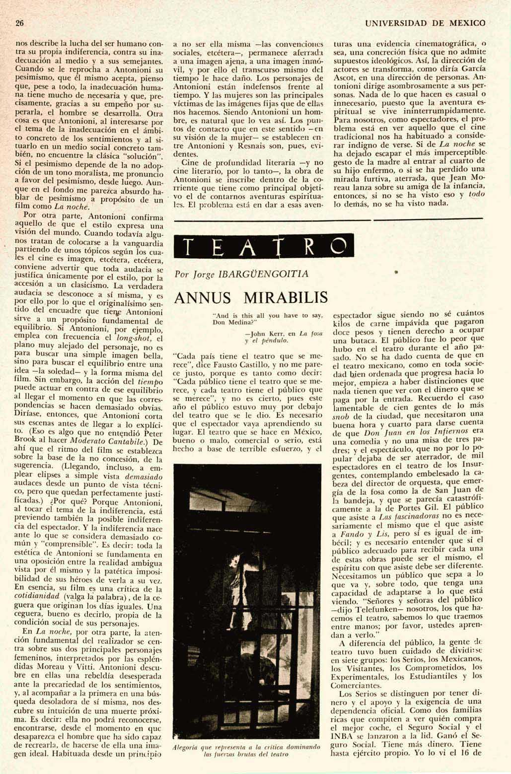 "Cada país tiene el teatro que se merece", dice Fausto Castillo, y no me parece justo, porque es tanto como decir: "Cada público tiene el teatro que se merece, y cada teatro tiene el público que se merece", y no es cierto, pues este año el público estuvo muy por debajo del teatro que se le dio. Es necesario que el espectador vaya aprendiendo su lugar. El teatro que se hace en México, bueno o malo, comercial o serio, está hecho a base de terrible esfuerzo, y el espectador sigue siendo no sé cuántos kilos de carne impávida que pagaron doce pesos y tienen derecho a ocupar una butaca. El público fue lo peor que hubo en el teatro durante el año pasado. No se ha dado cuenta de que en el teatro mexicano, como en toda sociedad bien ordenada que progresa hacia lo mejor, empieza a haber distinciones que nada tienen que ver con el dinero que se paga por la entrada. Recuerdo el caso lamentable de cien gentes de lo más snob de la ciudad, que necesitaron una buena hora y cuarto para darse cuenta de que Don Juan en los Infiernos era una comedia y no una misa de tres padres; y el espectáculo, que no por lo popular dejaba de ser aterrador, de mil espectadores en el teatro de los Insurgentes, contemplando embelesado la cabeza del director de orquesta, que emergía de la fosa como la de San Juan de la bandeja, y que se parecía catastróficamente a la de Portes Gil. El público que asiste a Las fascinadoras no es necesariamente el mismo que el que asiste a Fando y Lis, pero sí es igual de imbécil; y es necesario entender que si el público adecuado para recibir cada una de estas obras puede ser el mismo, el espíritu con que asiste debe ser diferente. Necesitamos un público que sepa a lo que va y, sobre todo, que tenga una capacidad de adaptarse a lo que está viendo. "Señores y señoras del público –dijo Telefunken– nosotros, los que hacemos el teatro, sabemos lo que traemos entre manos; por favor, ustedes aprendan a verlo."