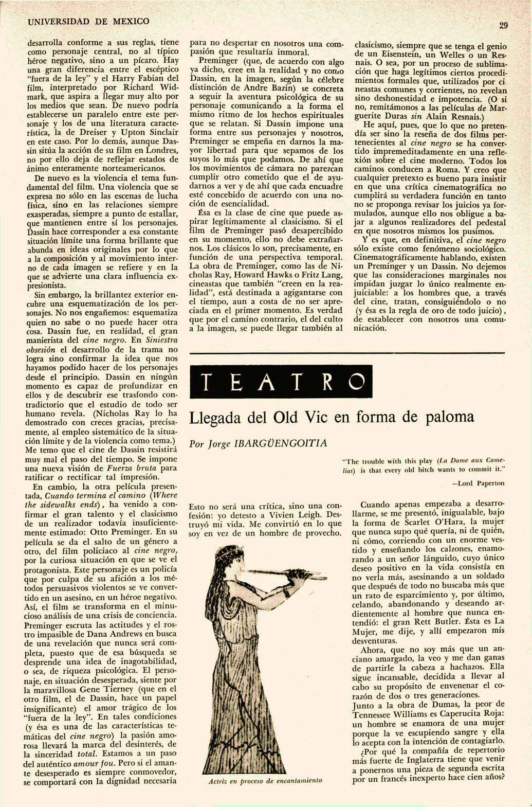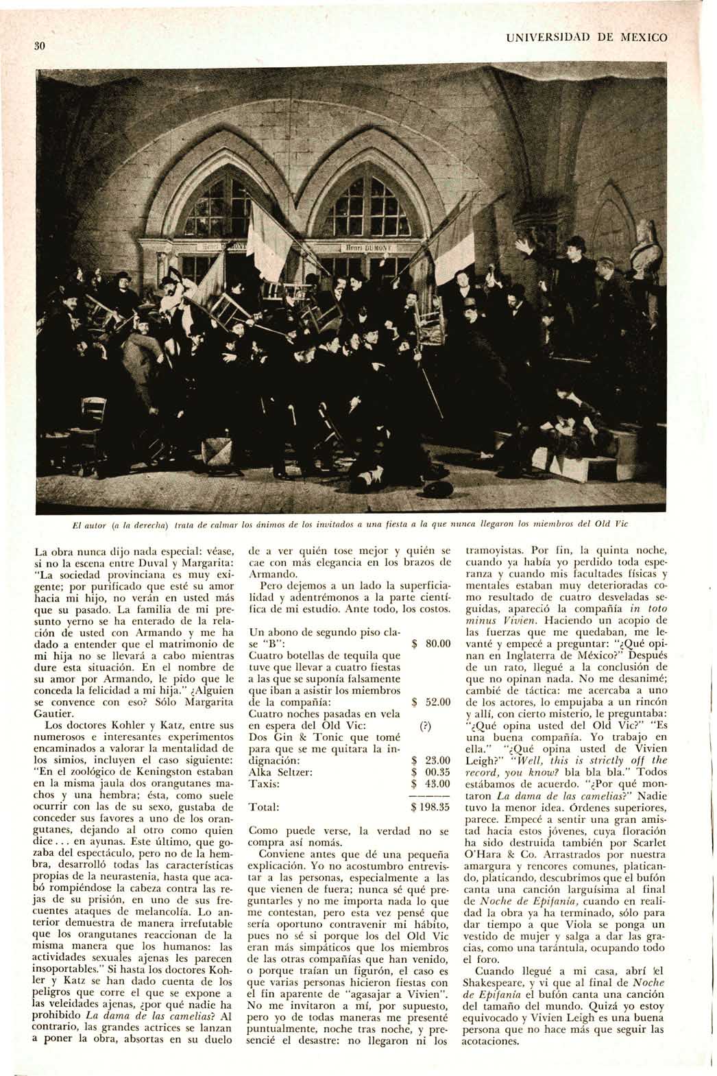 Conviene antes que dé una pequeña explicación. Yo no acostumbro entrevistar a las personas, especialmente a las que vienen de fuera; nunca sé qué preguntarles y no me importa nada lo que me contestan, pero esta vez pensé que sería oportuno contravenir mi hábito, pues no sé si porque los del Old Vic eran más simpáticos que los miembros de las otras compañías que han venido, o porque traían un figurón, el caso es que varias personas hicieron fiestas con el fin aparente de "agasajar a Vivien". No me invitaron a mí, por supuesto, pero yo de todas maneras me presenté puntualmente, noche tras noche, y presencié el desastre: no llegaron ni los tramoyistas. Por fin, la quinta noche, cuando ya había yo perdido toda esperanza y cuando mis facultades físicas y mentales estaban muy deterioradas como resultado de cuatro desveladas seguidas, apareció la compañía in toto minus Vivien. Haciendo un acopio de las fuerzas que me quedaban, me levanté y empecé a preguntar: "¿Qué opinan en Inglaterra de México?" Después de un rato, llegué a la conclusión de que no opinan nada. No me desanimé; cambié de táctica: me acercaba a uno de los actores, lo empujaba a un rincón y allí, con cierto misterio, le preguntaba: "¿Qué opina usted del Old Vic?" "Es una buena compañía. Yo trabajo en ella." "¿Qué opina usted de Vivien Leigh?" "Well, this is strictly off the record, you know? bla bla bla." Todos estábamos de acuerdo. "¿Por qué montaron La dama de las camelias?" Nadie tuvo la menor idea. Órdenes superiores, parece. Empecé a sentir una gran amistad hacia estos jóvenes, cuya floración ha sido destruida también por Scarlet O'Hara & Co. Arrastrados por nuestra amargura y rencores comunes, platicando, platicando, descubrimos que el bufón canta una canción larguísima al final de Noche de Epifanía, cuando en realidad la obra ya ha terminado, sólo para dar tiempo a que Viola se ponga un vestido de mujer y salga a dar las gracias, como una tarántula, ocupando todo el foro.