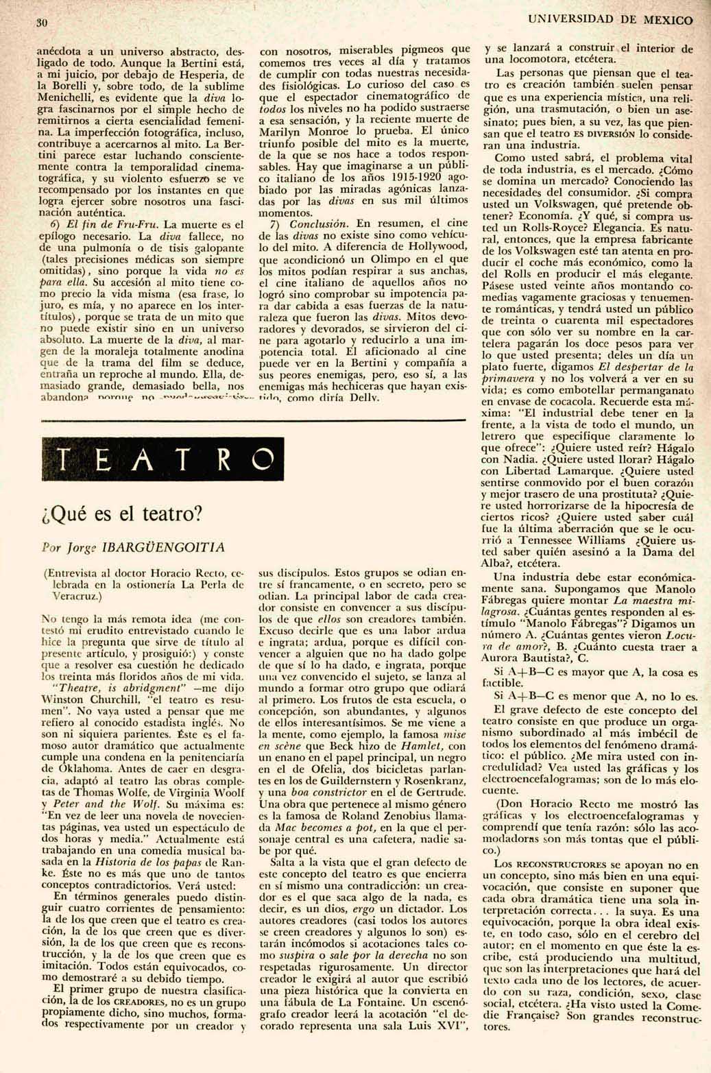 El grave defecto de este concepto del teatro consiste en que produce un organismo subordinado al más imbécil de todos los elementos del fenómeno dramático: el público. ¿Me mira usted con incredulidad? Vea usted las gráficas y los electroencefalogramas; son de lo más elocuente.