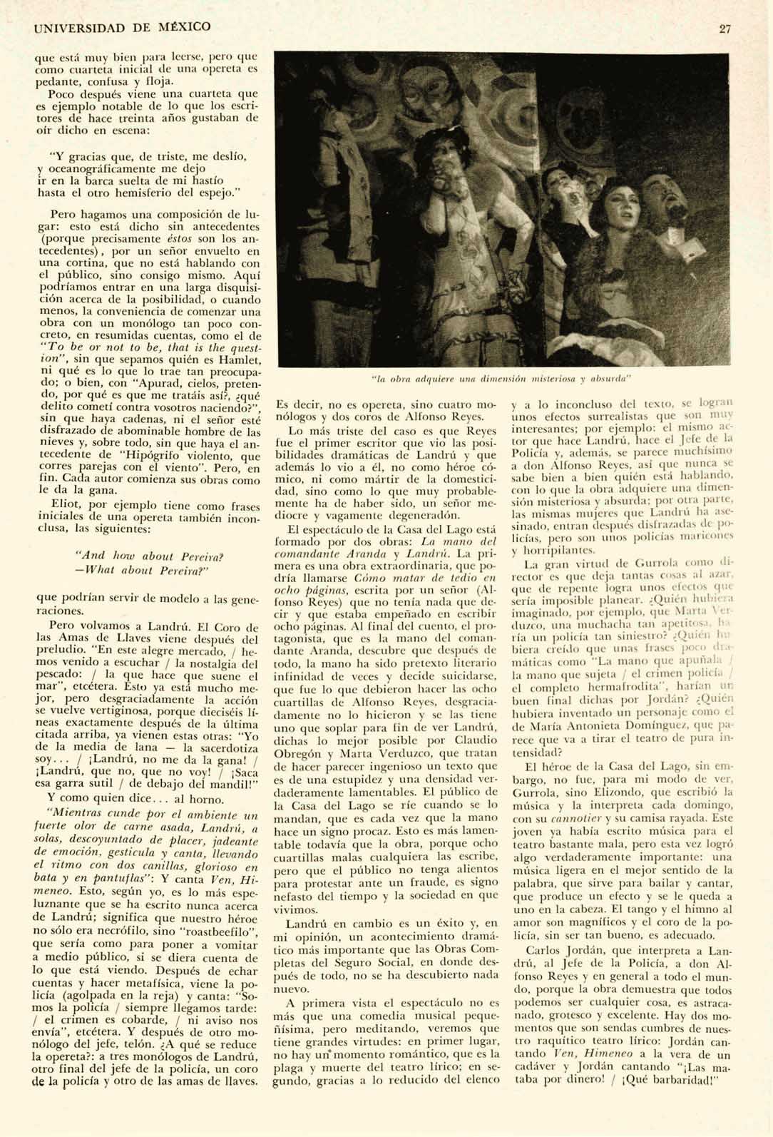 El espectáculo de la Casa del Lago está formado por dos obras: La mano del comandante Aranda y Landrú. La primera es una obra extraordinaria, que podría llamarse Cómo matar de tedio en ocho páginas, escrita por un señor (Alfonso Reyes) que no tenía nada que decir y que estaba empeñado en escribir ocho páginas. Al final del cuento, el protagonista, que es la mano del comandante Aranda, descubre que después de todo, la mano ha sido pretexto literario infinidad de veces y decide suicidarse, que fue lo que debieron hacer las ocho cuartillas de Alfonso Reyes, desgraciadamente no lo hicieron y se las tiene uno que soplar para fin de ver Landrú, dichas lo mejor posible por Claudio Obregón y Marta Verduzco, que tratan de hacer parecer ingenioso un texto que es de una estupidez y una densidad verdaderamente lamentables. El público de la Casa del Lago se ríe cuando se lo mandan, que es cada vez que la mano hace un signo procaz. Esto es más lamentable todavía que la obra, porque ocho cuartillas malas cualquiera las escribe, pero que el público no tenga alientos para protestar ante un fraude, es signo nefasto del tiempo y la sociedad en que vivimos.