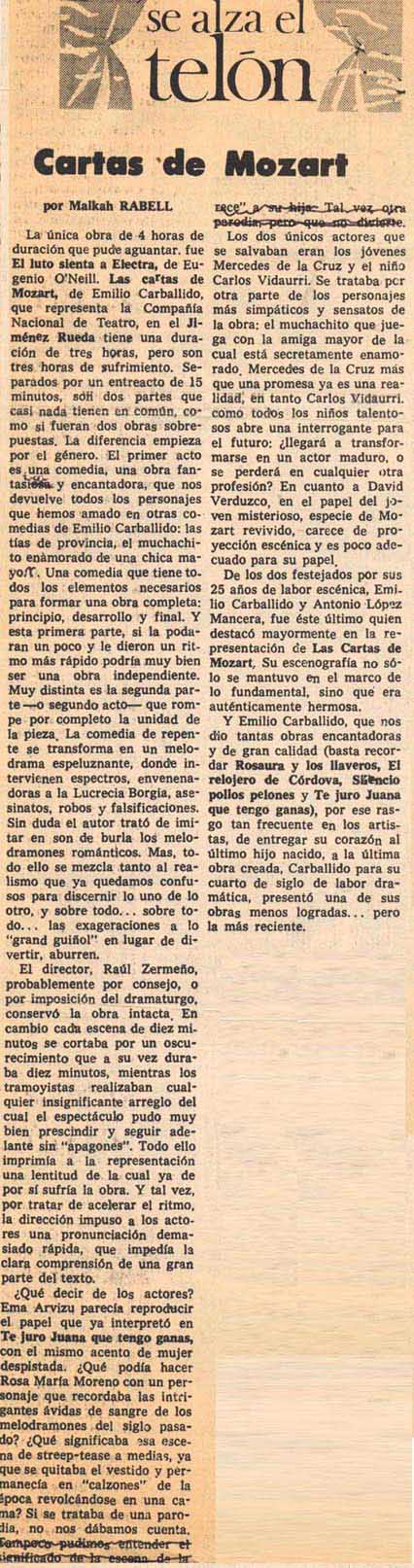 Cómo citar Rabell, Malkah. "Cartas de Mozart". El Día, 1975. Reseña Histórica del Teatro en México 2.0-2.1. Sistema de información de la crítica teatral, <criticateatral2021.org>