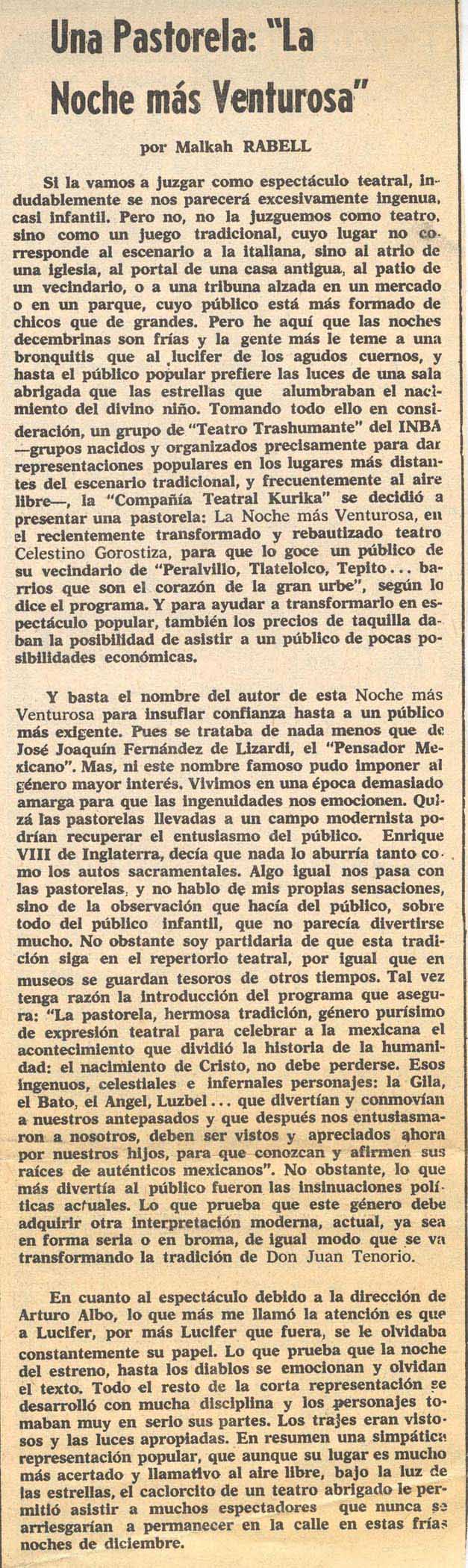 Cómo citar Rabell, Malkah. "Una pastorela: La noche más venturosa". El Día, 1975. Reseña Histórica del Teatro en México 2.0-2.1. Sistema de información de la crítica teatral, <criticateatral2021.org>