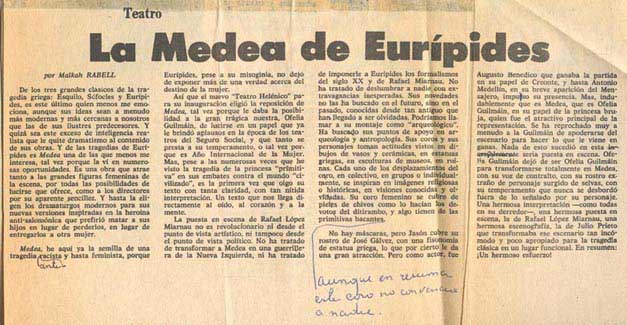 Cómo citar Rabell, Malkah. "La Medea de Eurípides". El Día, 1975. Reseña Histórica del Teatro en México 2.0-2.1. Sistema de información de la crítica teatral, <criticateatral2021.org>