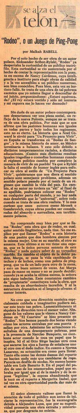 Por el solo hecho de ser obra de un autor polaco, Aleksander Scibor-Rylski, Rodeo ya despertaba la curiosidad de un público teatrófilo. Esta curiosidad se vio aumentada por el hecho de contar la representación con la puesta en escena de Nancy Cárdenas, cuya inteligencia e instituto para elegir obras de calidad y a la vez accesibles a un público numeroso, son bien conocidos. Pues bien, esta vez su instinto falló. Se trata de una obra de tal pobreza escénica que yo misma llegué a desconfiar de mi juicio, preguntándome: ¿Estaré equivocada? ¿El rey estará vestido y sólo mi tontería y mi ceguera me lo hacen ver desnudo?